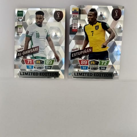 Panini Adrenalyn XL Qatar 2022 Limited Edition -jalkapallokortit. Kolmen kortin erä, joissa sama pelaaja ja rajoitettu erikoisversio. Kortit liittyvät FIFA World Cup Qatar 2022 -kokoelmaan ja sopivat keräilyyn tai kokoelman täydentämiseen.