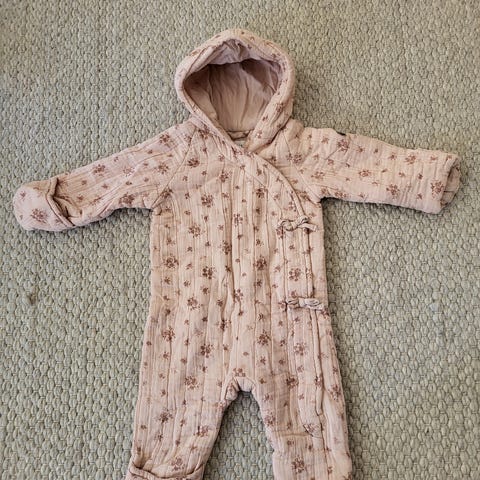 Newbie vauvan hupullinen puuvillahaalari kokoa 62. Edessä nappikiinnitys ja neulottu kohokuviopinta.