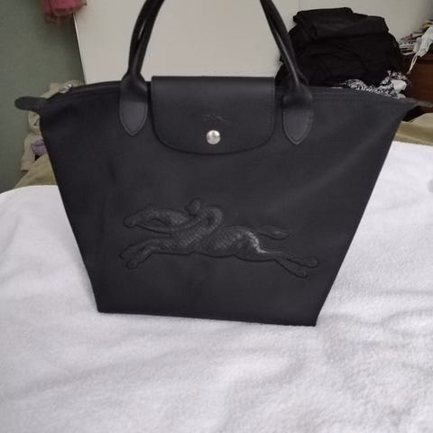 Longchamp le pliage L koko. Yleisilmeeltään siisti, hyvin pidetty laukku. Kulmat hieman käytössä ottanut osumaa laukulle tyypilliseen tapaan. Vetoketju ehjä. Väri musta.