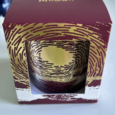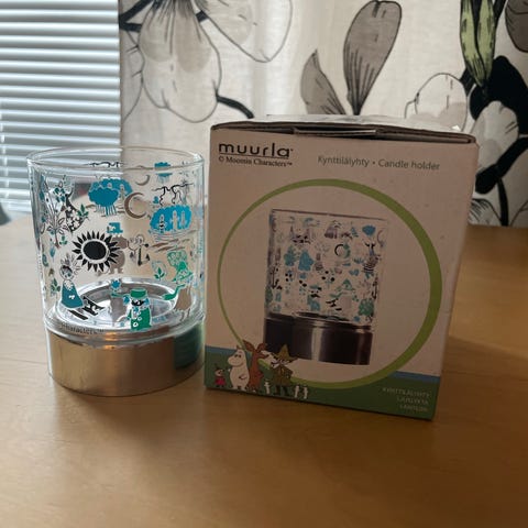 Arabia Muumi Moments of Magic kynttilä. Kynttilä on valkoisessa sisäosalla varustetussa mukissa, jossa on beige ulkopinta ja valkoiset Muumi-aiheiset kuvitukset ilotulituksineen. Paloaika on noin 30 tuntia ja nettosisältö 220 g. Pakkaukseen kuuluu alkuperäinen punainen lahjapakkaus sekä käyttöohjeet.