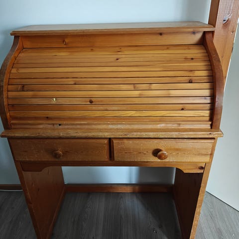 Hyvä kuntoinen lakattu kirjoituspöytä , ammattikoulun puuseppälinjan opinnäytetyönä tehty. Oikealla puolen 4 laatikostoa, vasemmalla 2 pienempää ja yksi isompi laatikko. Keskellä leveä pöytälaatikosto . Oikealta puolen puuttuu "leikkuulauta" . Laatikostot tehty sormiliitoksin. Pöydässä ei ole käytetty ruuveja. Lukot puuttuvat. Pöydän kansilevy on irtonainen ja hyvässä kunnossa, ei naarmuja.