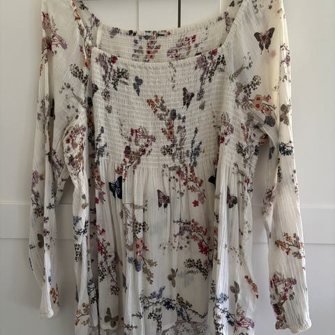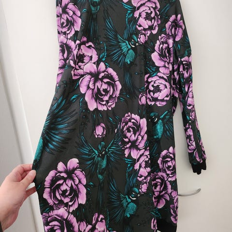 Erinomaisen kuntoinen musta joustavaa kangasta oleva musta kukallinen tunika, koko XL. Kai-kai 57 vm venyttämättä. Vino helma yksityiskohta.
