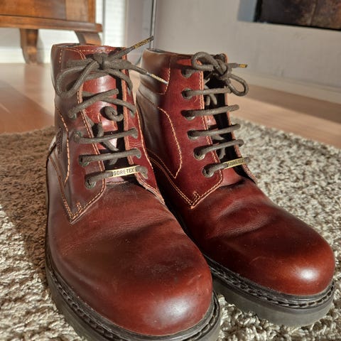 Lähes käyttämättömät mustat nahkaiset varsikengät nauhoilla ja vetoketjulla. Kengissä paksu ja tukeva kumipohja. Koko merkintä 10, on varmaan 45 vastaava, pohjallinen 295mm.