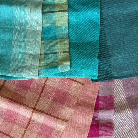 Puoli tusinaa eli kuusi kpl lautasliinoja, pellavadamastia. Design Dora Jung, malli 'Valmu'