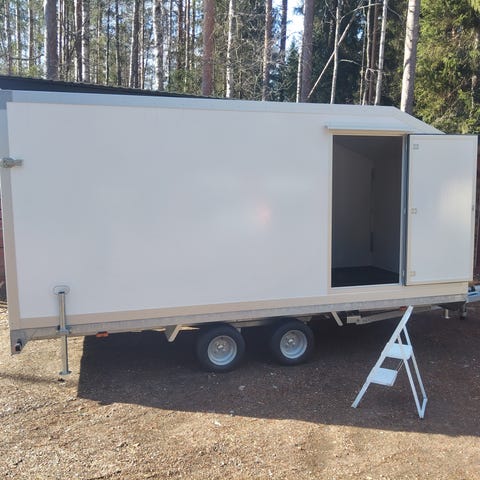 Kafin alustalle pari vuotta sitten tehty koppikärry. Sisämitat pituus 480cm, leveys 223,5cm ja korkeus 223cm. Varastoitu sisällä ja sen kyllä huomaa, siisti on. Takana pariovet ja oikealla käyntiovi. Sähkön sisäänottokotelo on ja sisällä sulake ja jokunen pistorasia, tuuletusventtiilit lattiassa ja katossa joten ilma kiertaa eli voi hyvin käyttää vaikka varastona. Seinät ja katto oli muistaakseni 30mm eristeellä ja lattia paksumpi eli tämä pysyy tarvittaessa myös lämpimänä vaikka sähköpatterin voimin. Itsellä tämä oli rakennustyömaalla työkalujen säilytysvarastona ja nyt seisoo käyttämättömänä. Hieno, siisti ja ehjä.