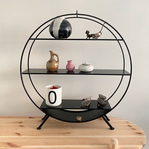 Hyllykkö, jossa on neljä hyllyä, yksi kapeampi (20,5cm) ja kolme 44cm syvää hyllyä. Korkeus takaa 124cm ja edestä n 87cm, leveys 60cm. Vain nouto. Runko mustaksi maalattua metallia ja hyllyt jotain puun näköistä, väri on muistaakseni tammi, mutta hyllyt eivät siis ole massiivipuuta.