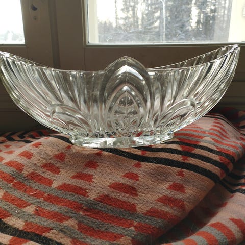 Kirkasta lasia, koristeellinen kaiverruskuvio kyljissä ja pohjassa. Soveltuu esimerkiksi tarjoiluun, hedelmäkulhoksi tai kattauksen osaksi.