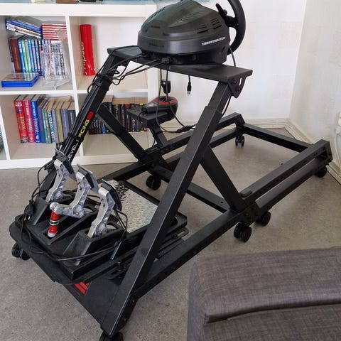 Playseat rigi mikä muokattu rankalla kädellä. Rullat rigin alla. Penkissä kiskot.