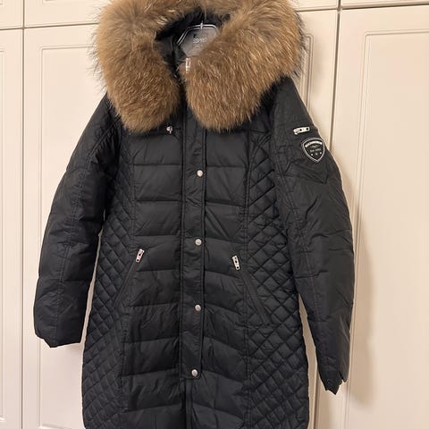 Rock and blue Ciara talvitakki. Musta, kultaiset vetoketjut. Täyte 80 % untuvaa ja 20 % höyheniä. Hupussa aito turkis.