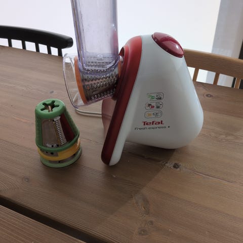 Sähköinen kasvisten viipalointi- ja raastinlaite. Viisi vaihdettavaa metallista raastinrumpua.