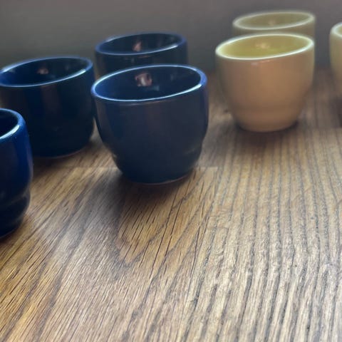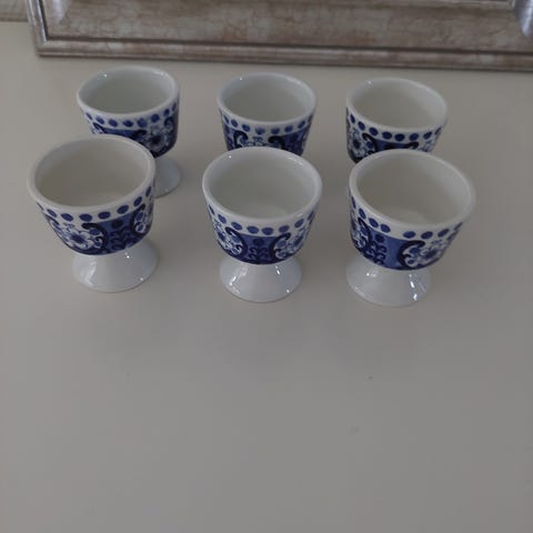 Arabian mallin ML munakuppi, yhteensä 5 kpl valkoisena. Munakupin korkeus on 4 cm ja yläreunan halkaisija 4,7 cm. Munakupit ovat muuten ehjiä, paitsi yhdessä on pieni pintahalkeama. Hinta on kaikkien yhteishinta.