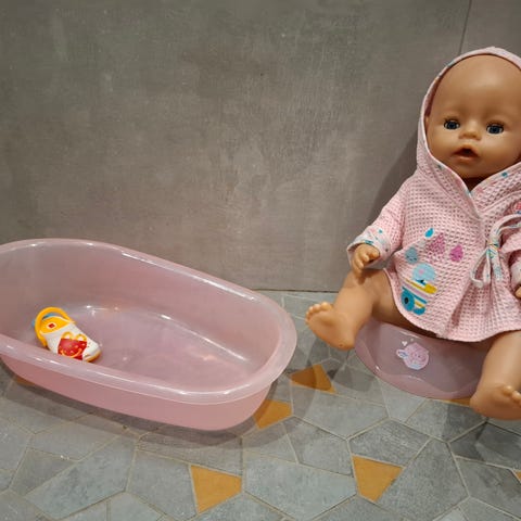 Myydään esimerkiksi Baby Born nukelle sopiva kylpyamme ja kylpylelu, Baby Born merkkiset potta, vaippa, kylpytakki ja sukkahousut sekä oikean vauvan paita. Nukke ei sisälly. 19e. Harviala.