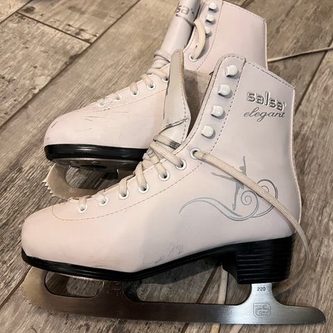 Salsa lasten taitoluistimet, koko 37. Valkoiset nahkajäljitelmäiset luistimet, joissa nauhakiinnitys ja korkea varsi nilkan tukemiseksi.