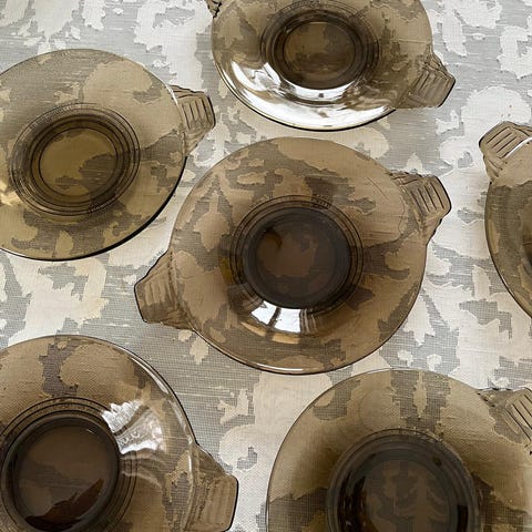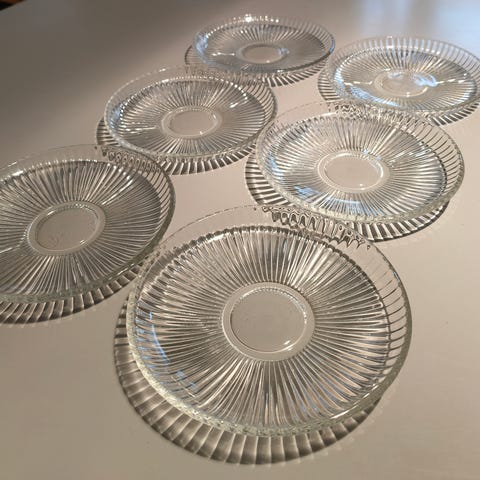 Kuusi hyväkuntoista, vanhaa lasilautasta 20 - 30 -luvulta, mallia on valmistanut tiettävästi Karhula (4181).