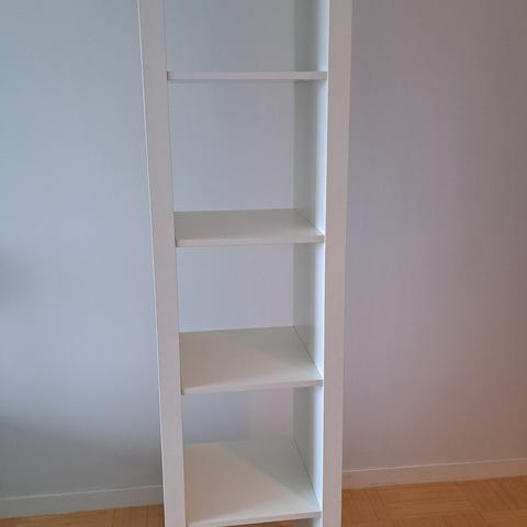 Vaalean tammen värinen hyllykkö. Jonkun verran naarmuja pinnoissa, etenkin pinnoissa, jotka olleet lattiaa vasten.