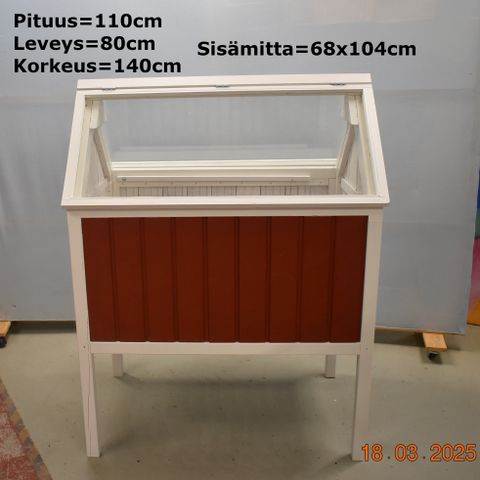Rungon väri on musta ja päällinen läpinäkyvää muovia, jossa on etupuolella rullattava aukko. Soveltuu esimerkiksi taimien esikasvatukseen ja kasvien suojaamiseen parvekkeella, terassilla tai pihalla.