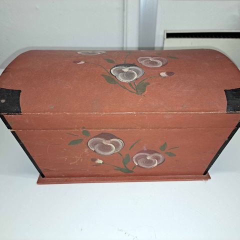 Iso tasakantinen kirstu. Hyvin patinoitunut kirstu, sopii esimerkiksi sohvapöydäksi. Leveys 97cm, korkeus 51cm ja syvyys 58cm.