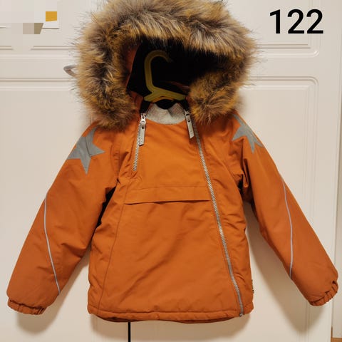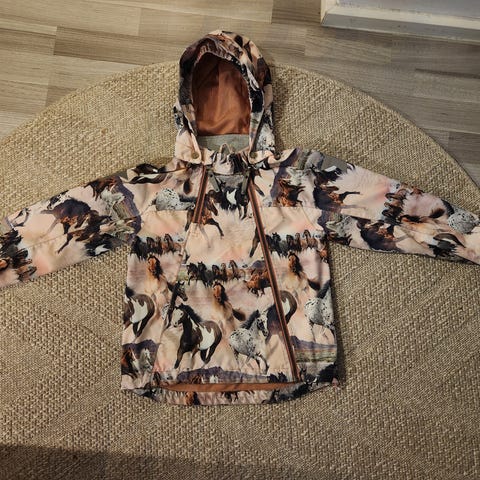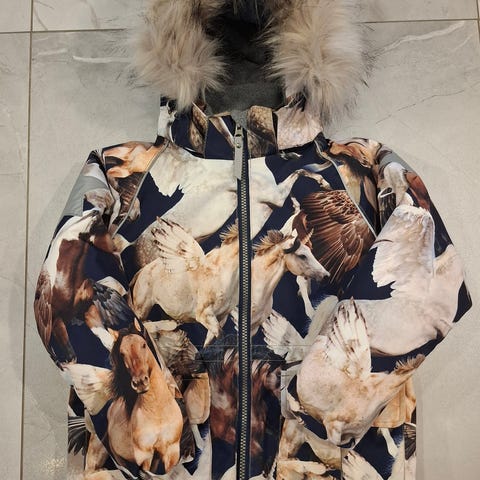 Molon hevoskuvioinen toppatakki kokoa 122. Karvareunushuppu. Paljon tykätty ja käytetty, kulumaa ja jälkiä on jonkun verran sekä hihoissa pikku reikiä, katso kuvat. Takaa irrotettu heijastin. Edelleen tosi lämmin. Koiratalous.