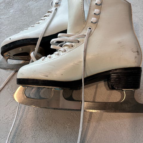 Valkoiset taitoluistimet, koko 36. Perinteinen nauhakiinnitys ja teräksiset luistinterät. Soveltuvat yleiseen luisteluun ja harrastekäyttöön. Ulkopinta on vaaleaa materiaalia, jossa käytön jälkiä kuvien mukaisesti. Korkea varsi tukee nilkkaa luistelun aikana.