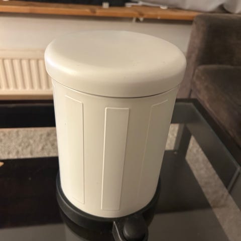 Kuvan mukainen roskis. Ehjä ja toimiva. Tilavuus 110l. Pölyinen, parempi pesu jää ostajalle,