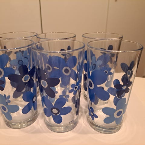 Myydään värikkäät juomalasit (6kpl), joissa on keltaisia ja oransseja raitoja.