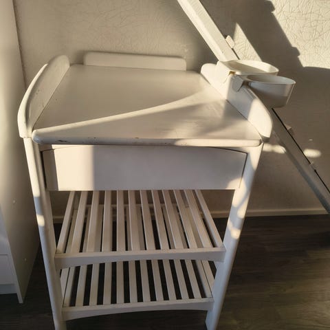 Beemoo valkoinen taitettava hoitopöytä. Todella hyvässä kunnossa, lähes käyttämätön. Alaosassa ylimääräinen taso tavaransäilytystä varten ja sivussa kori. Taidettiin tosin asentaa se väärin päin kasausvaiheessa, mutta eiköhän saa korjattua jos ottaa osiin. Pöydässä turvavyö ja ohjekirja tallessa.