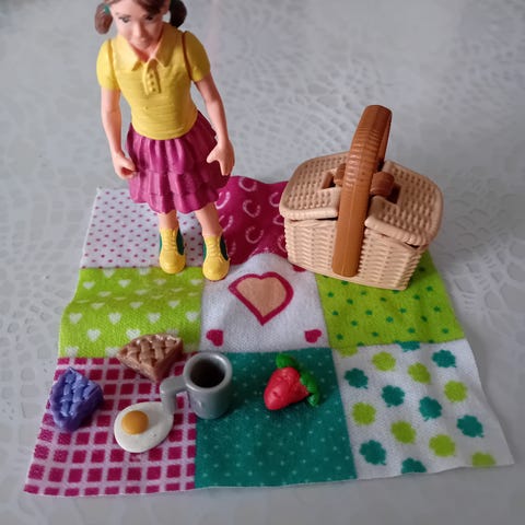 Schleich piknik-setti. Settiin kuuluu pieni värikäs tilkkutäkki sekä erilaisia pieniä leikkitarvikkeita, kuten kori ja maito- sekä mehutölkki. Erittäin hyväkuntoiset.