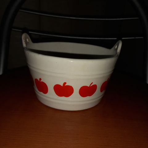 Myydään omenakuvioinen kulho ja kansi. Vähän Arabia pomona tyyppinen. Kulho hyvä kuntoinen ja kansi myös mutt kannessa pieni halkeama. Siitä kuva. Voi myös käyttää ilman kantta.
