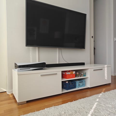 Taso sisältää sekä avointa hyllytilaa että suljettua säilytystä, joten laitteet ja johdot pysyvät siististi piilossa ja helposti saatavilla. Kiiltävä valkoinen pinta heijastaa valoa ja tekee tilasta avaramman tuntuisen.