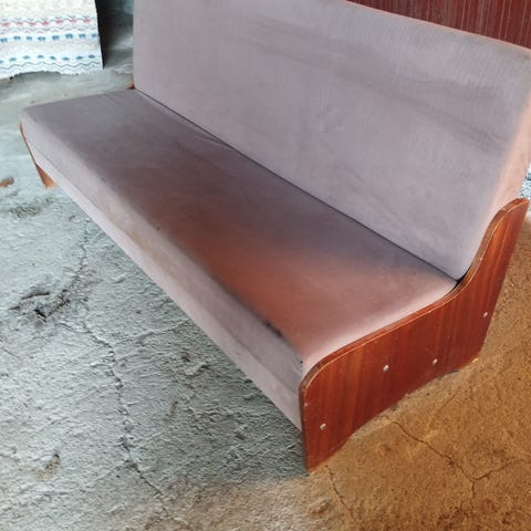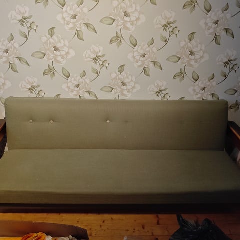 Annetaan iso ja vanha, punainen kulmamallinen vuodesohva, josko joku haluais tän pelastaa, ensi viikolla lähtee kaatopaikalle, täytyy saada remontin tieltä pois.