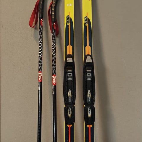 Fischer Sport Fibre maastohiihtosauvat, pituus 145 cm. Sukset Peltonen pituus 170cm. NNN-siteillä. Toimivat välineet.