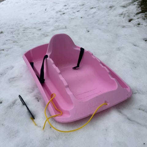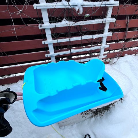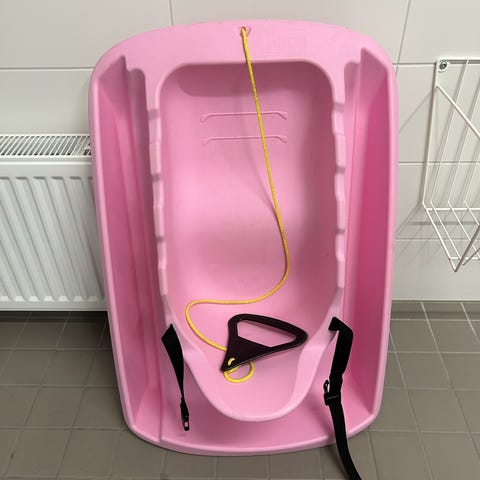 Plasto pulkka vauvalle, sininen muovinen malli. Pulkassa on muotoiltu istuin ja turvavyö lapsen kiinnittämistä varten sekä vetonarua vetämistä varten.