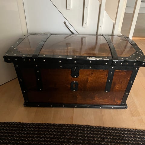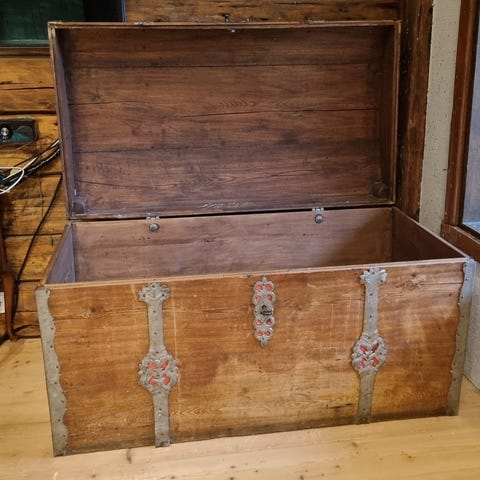 Vanha reilunkokoinen arkku jossa näkyy ajan patina. Leveys 110cm, korkeus 62cm ja syvyys 58cm.