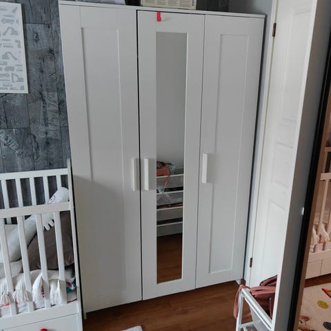 IKEA vaatekaappi, jossa on kolme ovea. Valkoinen väri. Sisältää useita hyllyjä ja vaatetangon. Mitat: leveys 117 cm, syvyys 55 cm, korkeus 179 cm.