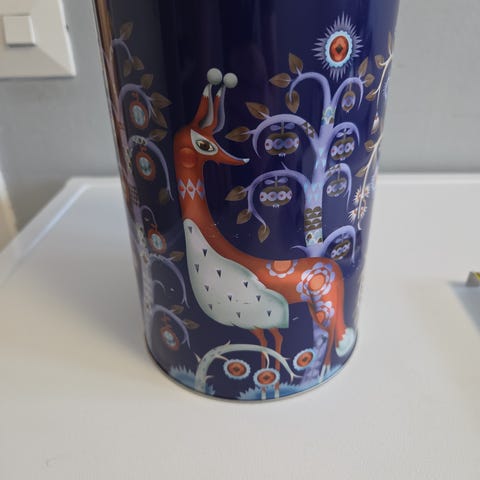 Iittala Taika purkki. Halkaisija 12 cm korkeus noin 19,5 cm. Ollut käytössä, käytön jälkeä on ja kolhuja. Käyttötavarana toimii hyvin.