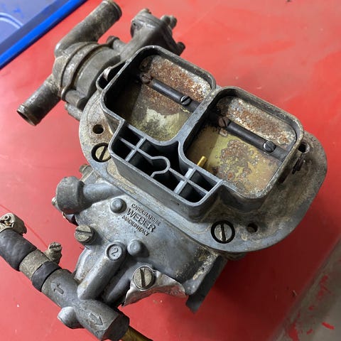 Alkuperäinen ennen vuotta -83 valmistettujen huolto ja korjaus ohjeistus, säätöarvoineen ja varaosanumeroineen Fordin muuttuvakurkkuista kaasutinta varten.