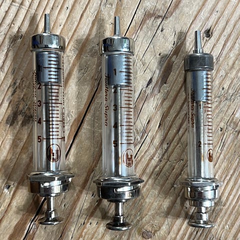 Vanhat lääkeruiskut 3kpl, 5ml, 2ml ja 1ml. Lasia ja metallia. Ei sisällä neuloja.