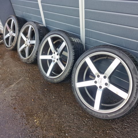 Hyväkuntoiset vanteet kesärenkailla. Et30. Kumeilla ajettu yksi kesä. Yksi kumi puhki huonon aurauskulman vuoksi, muissa on hyvin pintaa. Vanteiden ovh ~1700e.