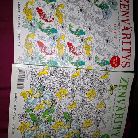 Mille Marotta Ihmeellinen viidakko -värityskirja ja Zenväritys-värityskirja. Molemmissa kirjoissa on yksityiskohtaisia viidakko- ja luontoaiheisia kuvia väritettäväksi. Kirjat sopivat aikuisille ja nuorille, jotka pitävät tarkasta ja runsaasta kuvituksesta. Sivut sisältävät mustavalkoisia piirroskuvia, joista osa voi olla osittain väritettyjä. Kirjat ovat pehmeäkantisia ja kooltaan noin tavallisen neliönmuotoisen värityskirjan kokoisia.