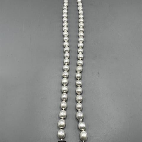 Chiara Pearl helmikaulakoru (2 kpl) by Alona. Aidot helmikaulakorut, jotka voi yhdistää pitkäksi kokonaisuudeksi tai käyttää kahtena erillisenä kätevän kiinnitysmekanismin ansiosta. Päässä koukkumainen musta kiinnike.Helmiketju, jossa on mustat koukut molemmissa päissä. Helmet ovat symmetrisiä ja kiiltäviä.Tyyli viittaa eleganttiin ja klassiseen korumuotoiluun, jolla on ajaton viehätys.Ketjun kunto vaikuttaa hyvältä; ei havaittavia vikoja.