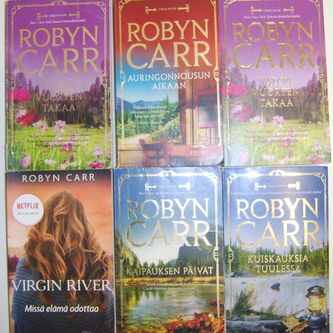 Robyn Carrin Virgin River kirjasarjan kolme ensimmäistä pehmeäkantinen kirjaa. Auringonnousun aikaan, Missä elämä odottaa ja Kuiskauksia tuulessa. Hyvä käytetty kunto, selkämyksessä taitetta ja ensimmäinen osa hieman ottanut alkusivuilla kosteutta, luettavissa ja irtonaisia kaikki sivut kuitenkin.