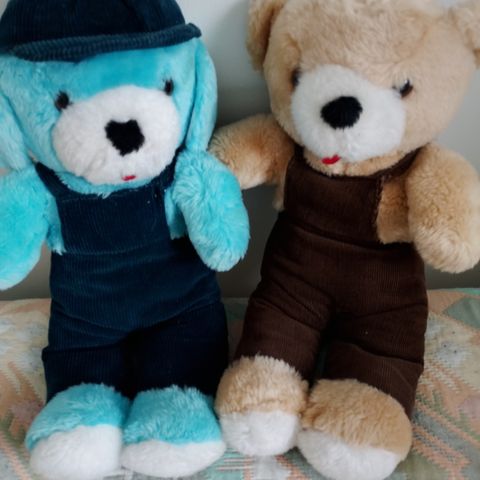 Pehmokarhut, kaksi kappaletta. Toinen karhu on ruskea ja toinen vaalea. Molemmat ovat pehmeää kangasmateriaalia ja sopivat lapsille leikkeihin tai unikavereiksi. Vähähajusteinen kissatalous.
