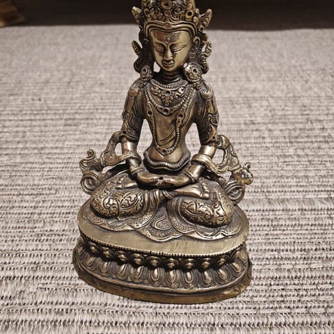 Hiekkakivi ja puujalusta Buddha patsas koko 10 cm x 5 cm.
