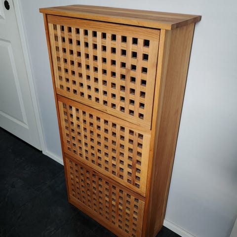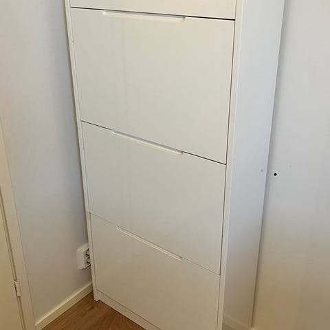 Terästä, kaappiin sopii aikuisen kenkiä n 6 paria, pienempiä 12. Voi kiinnittää seinään, reiät takana