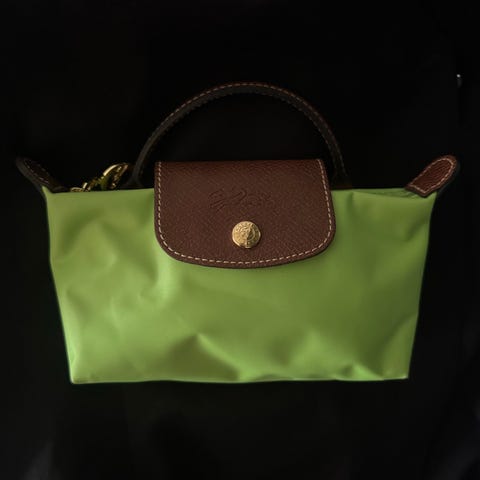Longchamp kangaslaukku naisille. Laukku on valmistettu kankaasta, ja siinä on ruskeat nahkaiset kantokahvat sekä läppä, jossa painonappi. Laukussa on vetoketjusuljenta metallisella Longchamp‑vetoketjuvedinkoristeella. Sopii arkilaukuksi ja pienten tavaroiden kuljettamiseen.
