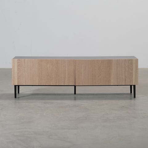 Blythe on tyylikäs TV‑taso, jonka paneloidulla saarniviilulla viimeistelty etuosa antaa sille modernin ilmeen. Kaksi tilavaa vetolaatikkoa tarjoaa käytännöllistä säilytystilaa elektroniikalle ja muille arjen tavaroille. Tämä TV‑taso yhdistää minimalistisen muotoilun ja funktionaalisuuden tyylikkääksi ja elegantiksi osaksi kodin sisustusta.