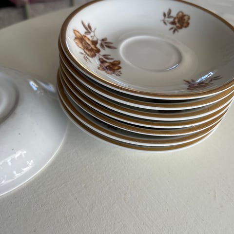 4 kol Arabia Kesäkukkakahvikuppi ja aluslautanen. Yhdessä lautasesta pieni lovi näkyy viimeisessä kuvassa