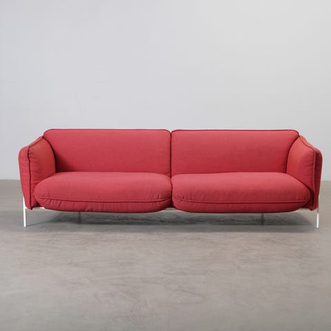 Swedesen kolmen istuttava Continental-sohva. Tilava sohva on verhoiltu punaiselal kankaalla ja sen runko on valkoiseksi maalattua terästä. Sohva on metalliyksityiskohtineen kaunis myös selkäpuolelta, joten sen voi sijoittaa vaikka keskelle huonetta.