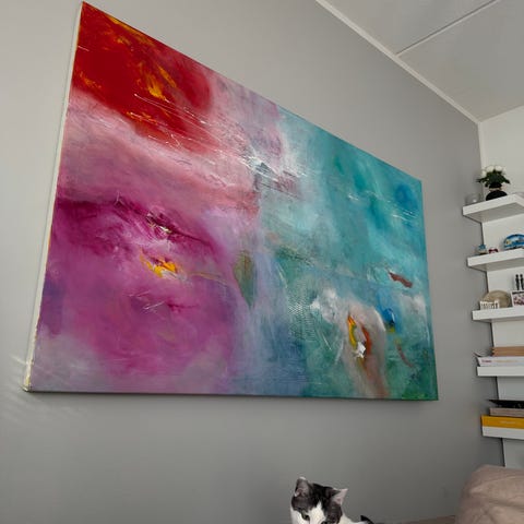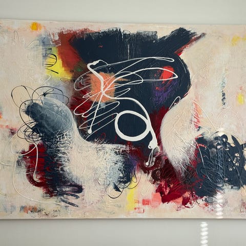 Abstrakti taulu, jossa mustan, harmaan, valkoisen ja keltaisen sävyjä. Maalaus on toteutettu kankaalle, ja siinä on kerroksellinen, roiske- ja viivamainen kuviointi. Sopii seinälle esimerkiksi olohuoneeseen, työtilaan tai muuhun sisätilaan sisustuselementiksi.
