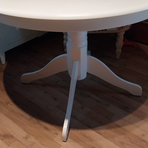 Neljän hengen tummanruskea puinen ruokapöytä. Käytön jälkiä on kuten kuvassa huomaa.
